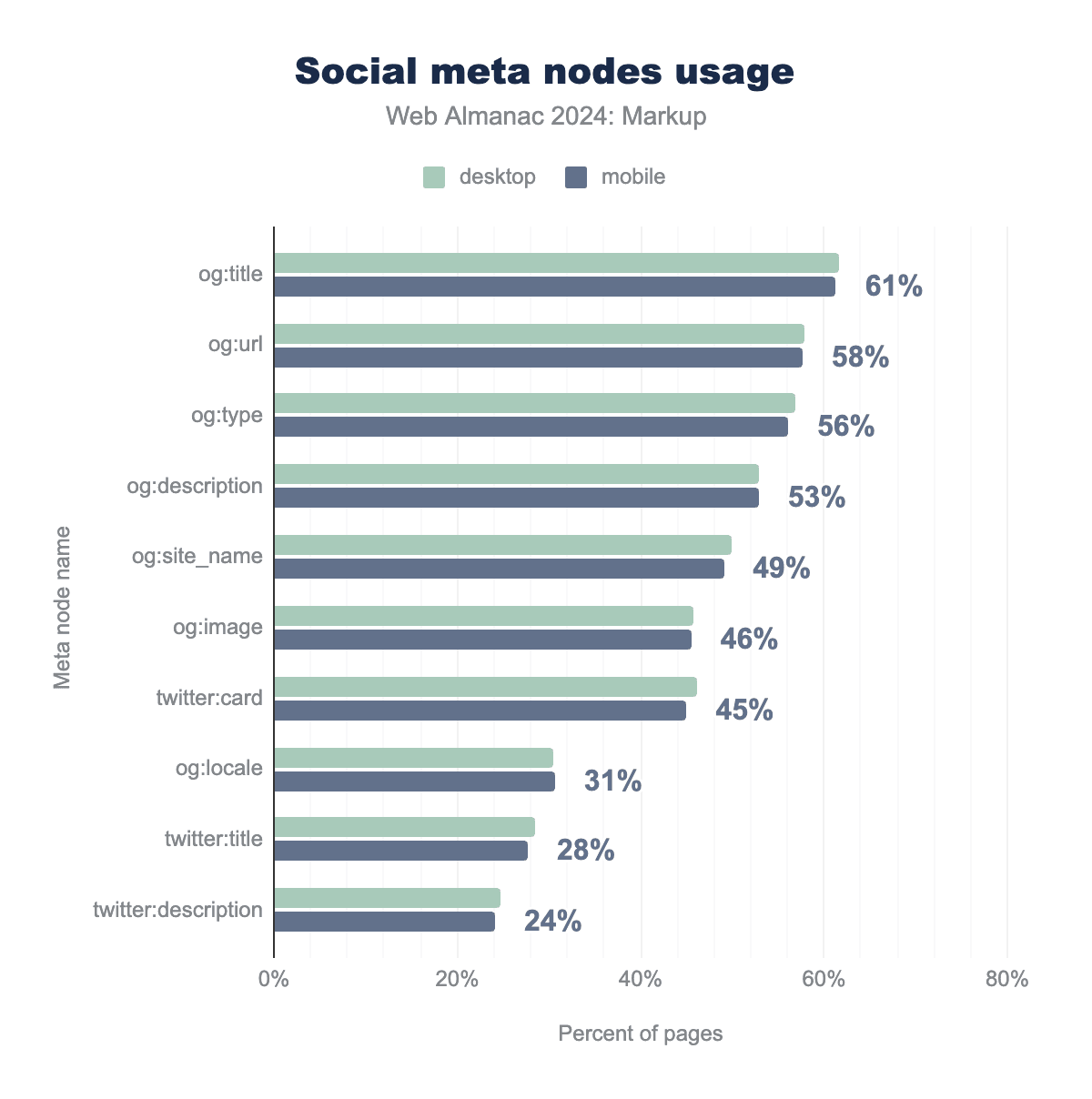 og:titleがもっとも使用されており(モバイルページの61%で使用)、次いでog:url(モバイルで58%)、og:type(モバイルで56%)、og:description(モバイルで53%)、og:site_name(モバイルで49%)。残りのトップ10はog:image、twitter:card、og:locale、twitter:title、twitter:descriptionで、値は46%から24%の範囲です。2024年のデータによると、もっとも頻繁に使用されているOpen Graphメタタグはog:title(モバイルページの61%で使用)とog:url(58%)です。これらのタグは共有されるコンテンツのタイトルと正規URLを定義し、og:type(56%)とog:description(53%)が続き、コンテンツタイプと簡単な要約を提供します。 twitter:card(45%)やtwitter:description(24%)などのTwitter固有のメタタグも、プラットフォームが現在「X」としてブランド変更されているにもかかわらず、依然として広く使用されており、プラットフォーム全体での用語の更新の遅れを示しています。