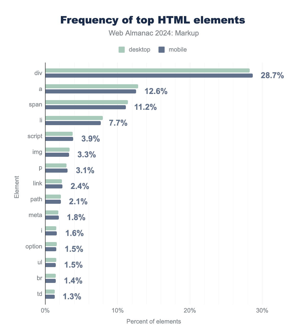 divがもっとも使用されており(モバイルで28.7%)、次いでa(12.6%)、span(11.2%)、li(7.7%)、script(3.9%)。残りの上位15要素はimg、p、link、path、meta、i、option、ul、br、tdで、値は3.3%から1.3%の範囲です。<div>に続いて、<a>要素は一貫して2位を維持する重要な要素です。ハイパーリンクの基盤として、サイト間のユーザージャーニーのナビゲーションで重要な役割を果たしています。